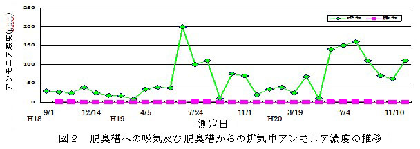 4.鶏ふん乾燥ハウスからブロアー(表1)を用いて捕集するアンモニア濃度は、吸気部で最大200ppmに達するが、脱臭槽通過後の排気部では全期間を通じて2ppm以下となり、顕著なアンモニア除去効果が認められる。(図2)。