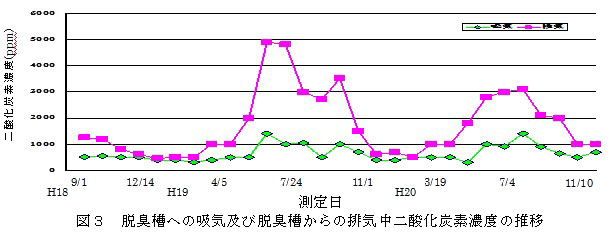 5.脱臭槽への通気前後でCO2濃度が50~3,800ppm増加していることから、広葉樹チップが硝化、脱窒菌への炭素供給源の役割を担い、他から有機物の供給を求めることなく生物脱臭が進行しているものと考えられる。(図3)。