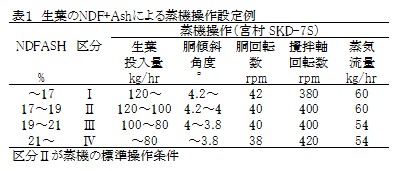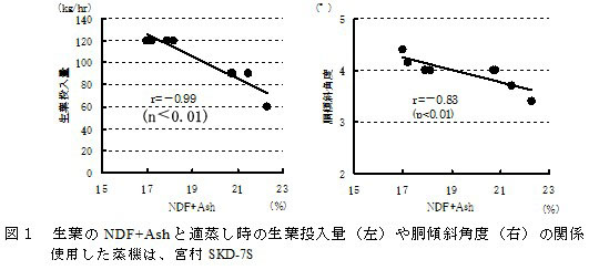 1.生葉の熟度等の特性を、熟練者が判定し行う適蒸し状態の蒸機操作条件と、生葉のNDF+Ashとの間には、一定の関係が見られ、特に生葉投入量や胴傾斜角度との関連が強い(図1)ことから、NDF+Ashを生葉の熟度の指標とすることができる。NDF+Ashに応じた蒸熱条件の設定例は(表1)のとおりである。
