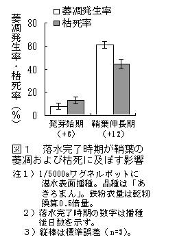 | [要約] | 水稲鉄コーティング直播栽培において、湛水播種後発芽始期に落水状態とすることで、吸水不足と鞘葉の萎凋が回避され、苗立率が向上する。 再入水時期は除草剤散布時期を考慮し、イネ1葉期とする。 |