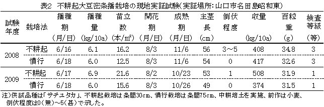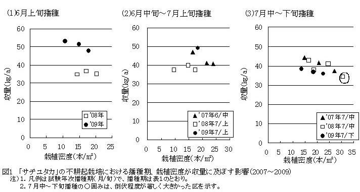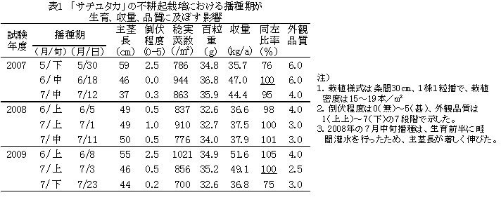 | [成果情報名] | 大豆「サチユタカ」の不耕起栽培における播種適期と播種期に応じた栽植密度 |