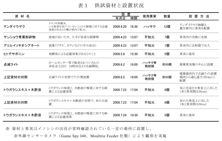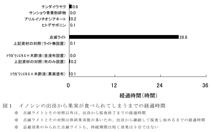 | [要約] | 臭いや味による5種の忌避資材は、イノシシに対して全く効果を示さない。点滅ライトはイノシシに 対して忌避的な影響を与えることができるが、その持続期間は短く効果は十分ではない。 |