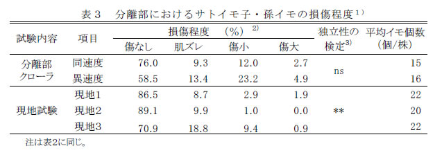 | [要約] | イモ株の掘り上げから親イモと子・孫イモの分離、土の分別、コンテナへの収納まで連続して行う 一工程収穫機であり、分離は搬送中にハの字配置したクローラで行い、イモの損傷割合も低い。作業能率は 2名の人力組作業と比較して約3倍の10a/1日である。 |
