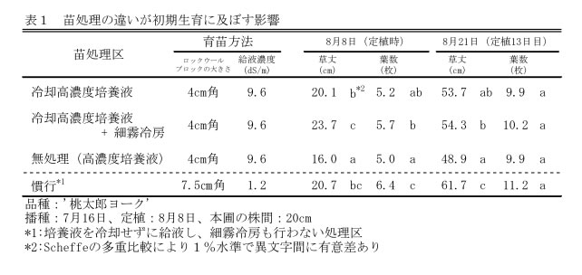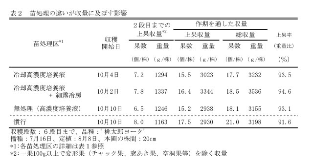 | [成果情報名] | 育苗時の冷却高濃度培養液と細霧冷房によるトマト抑制栽培の増収技術 |