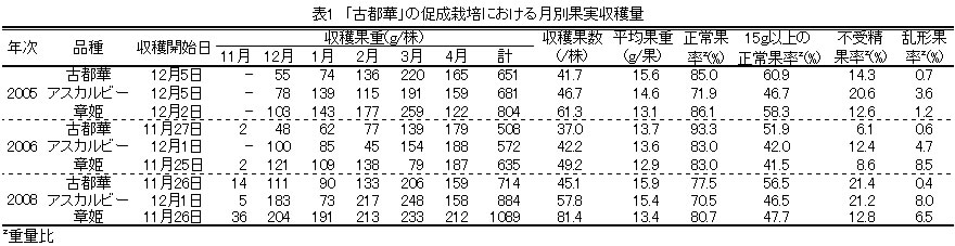 | [要約] | イチゴの促成栽培用の新品種「古都華」は、「アスカルビー」と比較して収量が少ないが、15g以上の 正常果の収量は同等以上であり、果実の糖度、酸度および硬度は収穫期間を通して高く、直売等の直接取引に 適する。 |