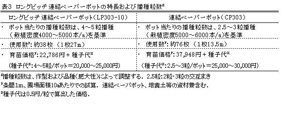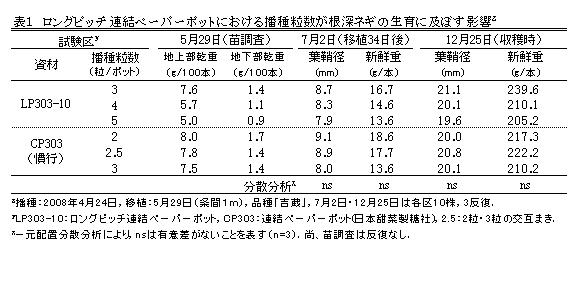 | [成果情報名] | 育苗コストの低減が可能なロングピッチ連結ペーパーポットによる根深ネギの栽培 |