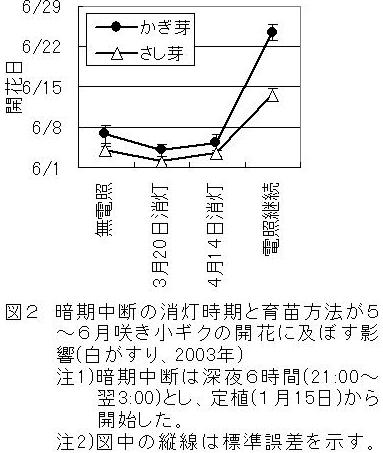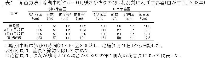 | [成果情報名] | 挿し芽苗と暗期中断による5~6月咲き小ギクの開花斉一性と切り花品質の向上 |