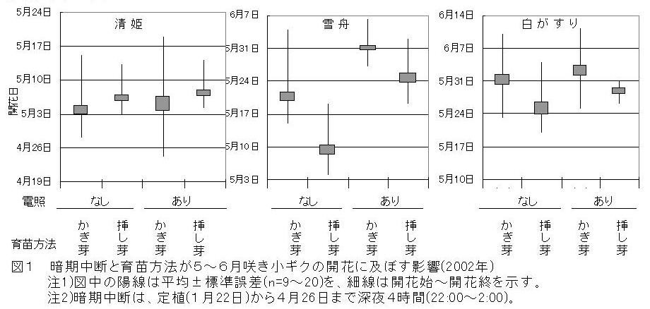 | [キーワード] | 5~6月咲き小ギク、半促成、暗期中断、開花斉一性 |