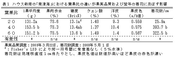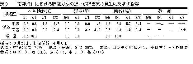| [要約] | 「南津海」のハウス栽培では、連年結実には最終葉果比40とし、退色や浮皮の少ない葉裏の果実を利用する。 収穫時期は、3月中旬から4月上旬とし、貯蔵は常温では1か月程度であるが、8℃程度、湿度90%で 低温貯蔵すれば7月までの長期出荷が可能となる。 |