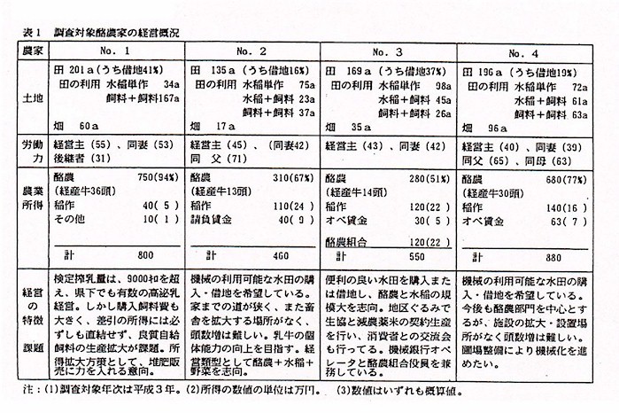 調査対象地域では、農業構造改善事業以来酪農の産地化に取り組み、酪農組合の設立や公共放牧場設置等が行われた。さらに補助事業・人工授精組織・家畜市場など肉用牛部門と結合した産地活動を行っている。中山間地域における酪農経営の存立にはこのような農家集団としての活動や産地形成へ向けた組織的対応が不可欠の前提をなしている。