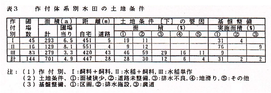%を占め、その土地条件は面積狭小・道路未整備・排水不良など悪条件の圃場の割合が高い。これを改善し、貸借を促進し、稲作部門の拡大と飼料基盤としての水田の活用を図る必要がある。(