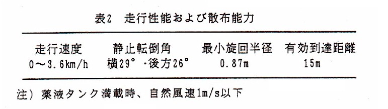 と超小型である。本機は静油圧変速機により無段階に変速でき、レパー操作で旋回内側のクローラを逆回転させてその場で旋回できる。防除部は、軸流送風機を取り付けた吐出口径