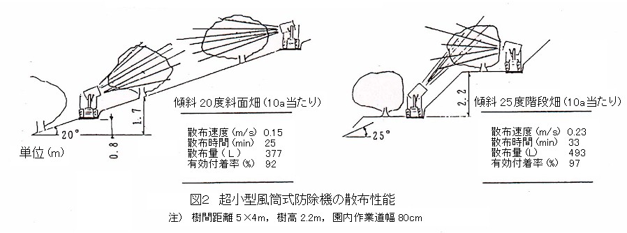 度以上の急傾斜地は全体の半分近くを占める。そこでは、密植栽培が多くしかも樹列間の高低差が大きいため、スピードスプレーヤなど従来の防除機が導入できず、労働負担の大きい手散布による防除作業が行われている。そこで、園地の大幅な改造や改植を行わず作業者の負担を軽減して高精度に防除ができる超小型の風筒式防除機を開発した。