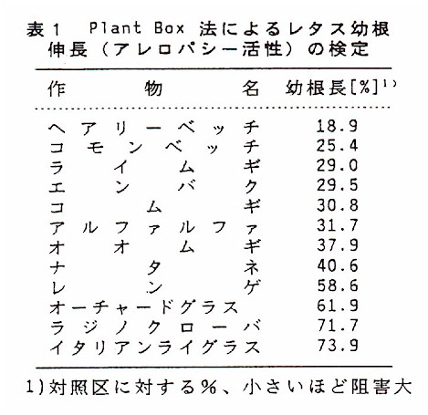 法でアレロパシーを検定すると、ヘアリーベッチの活性は高いが、レンゲは活性が小さいこと(