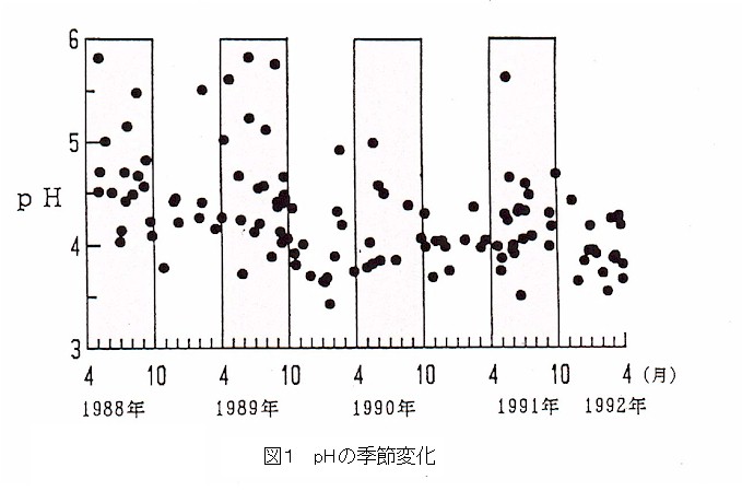 1988年4月から4年間の降雨のpHの平均は4.28であり、pH5.6以下の