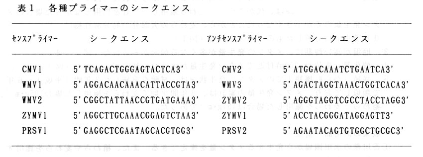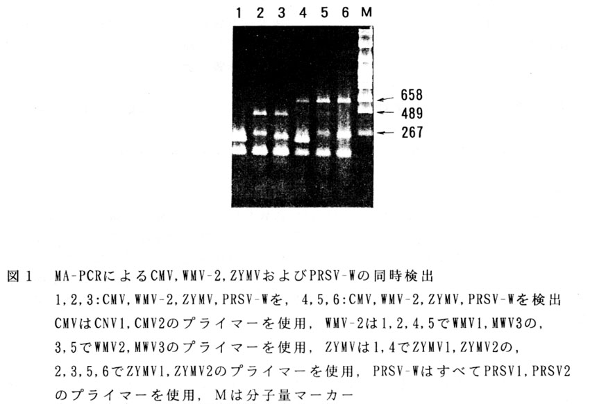 キュウリのモザイク病株にはキュウリモザイクウイルス(CMV)、カボチャモザイクウイルス(WMV-2)、ズッキーニ黄斑モザイクウイルス(ZYMV)およびパパイヤ輪点ウイルス-W系統(PRSV-W)が2種あるいは3種で混合感染していることが多い。そこでRT-PCRによるキュウリのウイルス診断の実用性を高めるため、1回のRT-PCRおよび1レーンでの電気泳動でこれらを同時に検出する手法を確立する。
