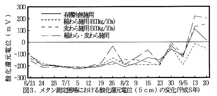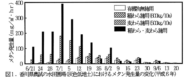 大気中のメタンの濃度は、地球の温暖化に影響を与える。有機物を施用した水田からは、その分解に伴いメタンが発生する。メタンの発生量は正確に把握されていない。また、香川県内の水田は遊離酸化鉄の少い圃場が多いために、酸化還元電位が低くなっており、メタンの発生量が多いものと考えられる。そこで、代かき直前の麦わらや、前作の麦播種前の稲わら の施用がメタンの発生量に及ぽす影響を明らかにすると共に、地温や酸化還元電位等との関連を検討した。
