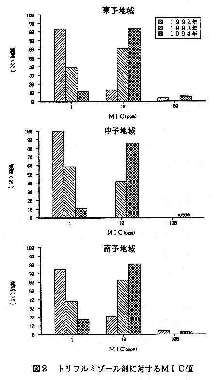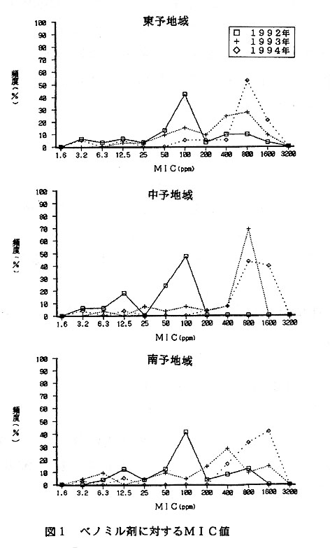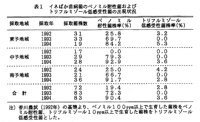 イネばか苗病は、近年薬剤耐性菌が全国的に出現し、本病の発生原因の一つとして問題となっている。そこで、愛媛県下における耐性菌の有無を明らかにするため、ベノミル剤およびトリフルミゾール剤に対する感受性検定を実施した。