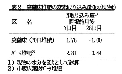 シメジ廃菌床は、主原料であるスギオガクズに米ぬかや脱脂大豆粉等を添加混合後、蒸煮殺菌し、キノコ培養を行った後の残さである。そのため、C/N比はスギオガクズ(487)に比べかなり低下(87)している。また、野菜に対する生育阻害は認められない(