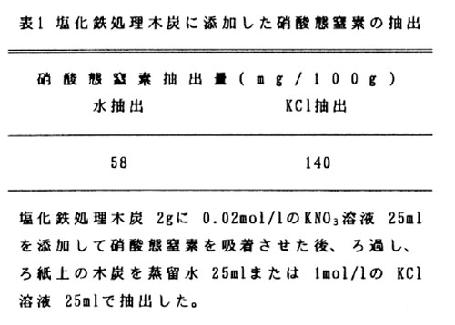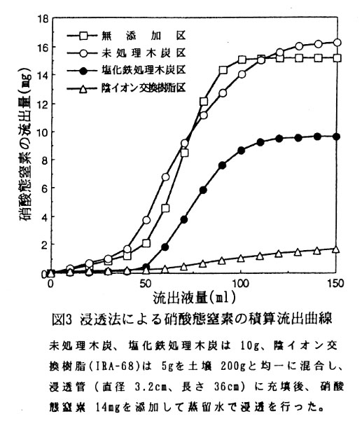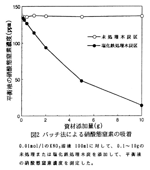 農耕地に施用された窒素肥料の多くは硝酸態窒素として土壌から流出し、周辺の水系の汚染につながっている。日本の水道水の水質基準では硝酸態窒素は10ppm以下に規定されており、人体に対する悪影響も報告されている。硝酸態窒素は陰イオンとして負の荷電を持つため、これを化学的に吸着させて流出を抑制するためには、正の荷電を持つ担体の開発と利用が必要である。本研究では、木炭を塩化鉄(Ⅲ)溶液で浸漬処理することによって硝酸態窒素を吸着する資材の開発を試みた。