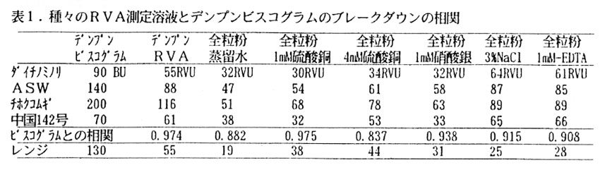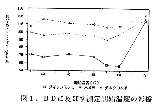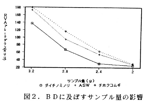高品質小麦の栽培条件を解明するためには多数サンプルの製めん適性を少量で迅速に評価する必要がある。製めん適性の評価項目として、デンプンの糊化特性の一つであるブレークダウン(BD)は官能審査での粘弾性と関連があるとされている。しかし、従来のビスコグラフによる測定法では、原麦を小麦粉に製粉し小麦粉から単離したデンプンが1点につき45g(乾物重)必要で、測定時間は60分程度かかる。