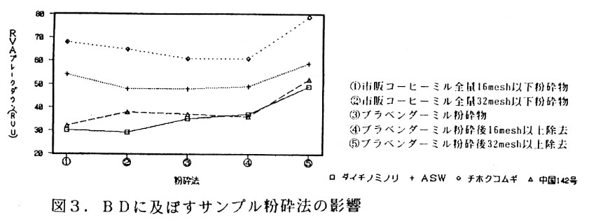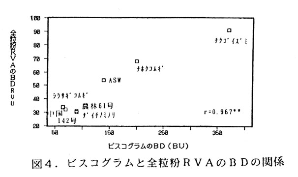 そこで、粘度測定器であるラピッドビスコアナライザー(RVA)を用い、小麦の製めん適性を簡易・迅速に評価するため、小麦原麦を粉砕した全粒粉によるBDの測定法について検討する。