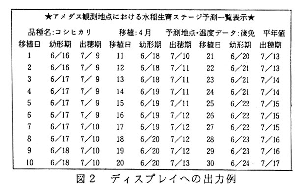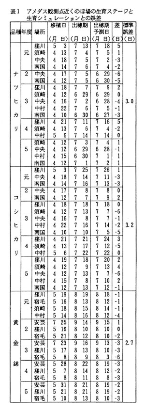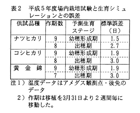 高知県では気象データをもとにした水稲の生育予測法はなく、また移植時期を変えた場合や新たな品種を導入した場合に、その地域でどのような生育を示すか、指標となるものも少なかった。 そこで、水稲の生育と気象要因の関係にもとづく生育シミュレーション技術の確立が望まれていた。