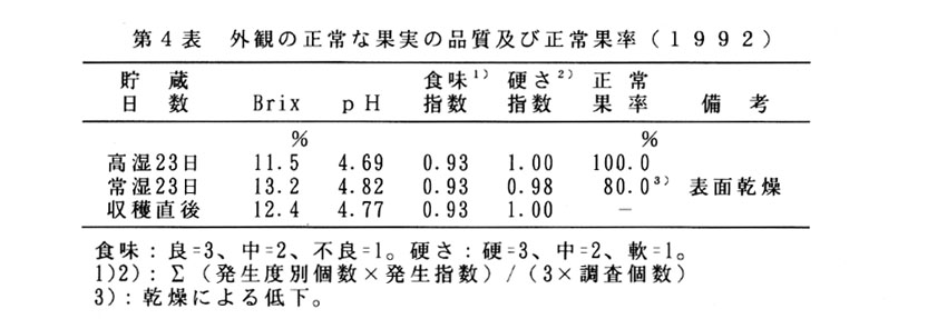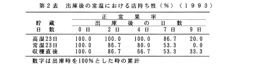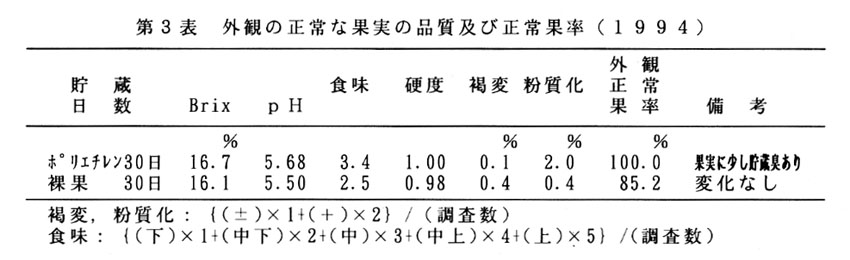 本県でのモモ栽培は、7月中下旬からの夜蛾の被害が甚だしいため、その頃までに収穫する早生・中生品種が中心となっている。しかし、販売価格は新盆時期がもっとも高く、有利販売するには2~3週間の貯蔵が必要であるが、果実特性から常温ではすぐに軟化し劣化する。そこで貯蔵方法を検討して、出荷調整のための貯蔵技術を確立し、旧盆出荷の可能性を検討する。