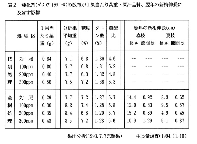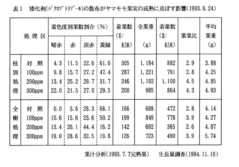 矮化剤(パクロブトラゾール)のヤマモモ緑化木(茎葉散布・土壌灌注)に対する登録は既にあるが、果樹としての登録拡大のための基礎資料を揃えるとともに、開花末期の茎葉散布が果実の形質に及ぽす影響を明らかにする。