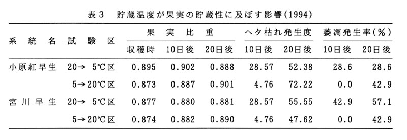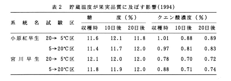 香川県では早生温州の個性化商品として、坂出市において発見された‘小原紅早生’の植栽をすすめている。しかし、本系統は果皮色が濃紅色である、浮皮の発生が少ない等の優れた特性を持つものの、収穫時期における果皮陽光面の退色が認められ、栽培上の課題となっている。そこで、果実品質を低下させることなく、着色の向上を図り、果実間の果皮色のばらつきを軽減させるために‘小原紅早生’の5℃と20℃の温度条件による変温貯蔵が、果皮色、果実品質等に及ぽす影響について検討した。
