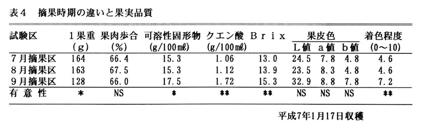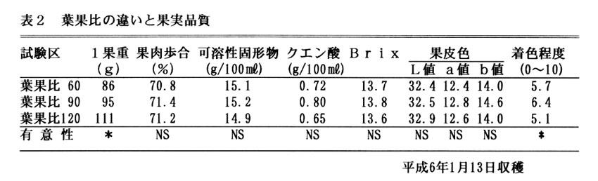 ポンカンは、高温多雨な気候を好み年平均気温20℃前後のところが適地とされているが、瀬戸内地域は年平均気温が2~3℃低く、果実が小玉傾向にある。このため、瀬戸内の気候に適した条件でポンカンの大玉果生産が望まれており、品質、肥大の影響が大きい摘果の程度と最適時期を解明することで大玉高品質果の生産を図る。