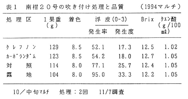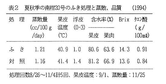 年によって異なるがウンシュウミカンでは浮皮の発生が、宮内伊予柑では樹上での果皮障害の発生が問題となっている。これらの生理障害発生には品種固有の果皮形態や蒸散特性が関与していると考えられる。そこで、実用的な蒸散調節法によってこれらの防止策を検討する。