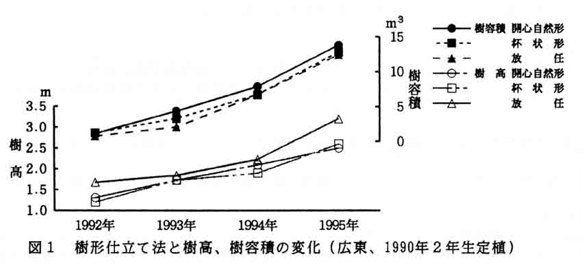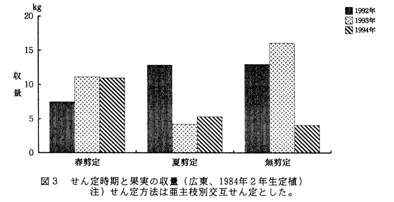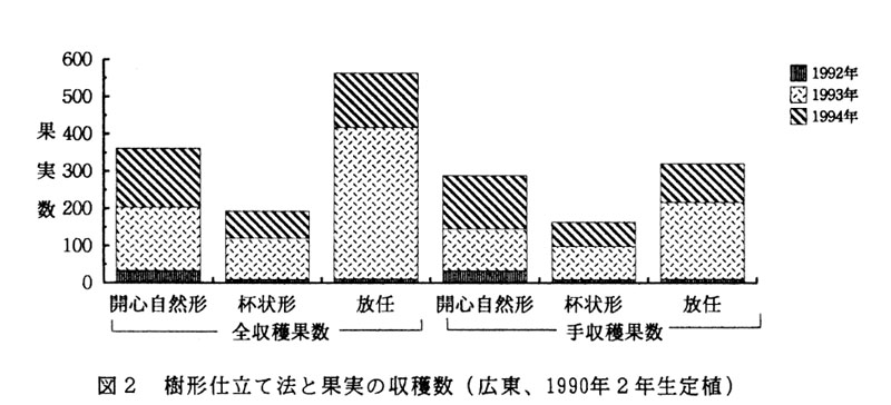 - 累積収量では放任樹が勝るが、開心自然形樹は隔年結果性が少なくなる。
