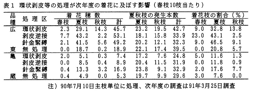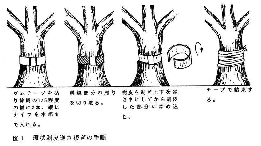ヤマモモは結果樹齢に達するのが遅く、最も早い品種でも5年程度かかり亀蔵では8年以上かかるのが通常である。そのため、早期成園化が難しく、このことがヤマモモの園地裁培化が進まない一因となっている。 そのため、環状剥皮逆さ接ぎ等による着果促進技術の開発に取り組んだ。