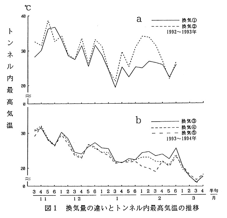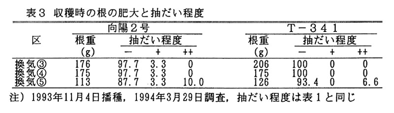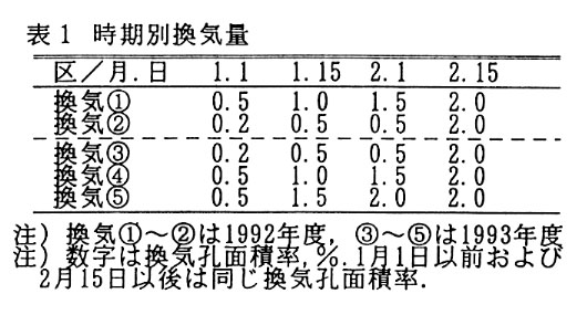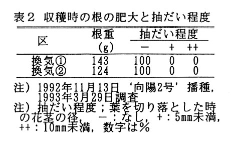 トンネルを利用したニンジンの3月どり栽培では、年内の生育が旺盛になるためトンネル換気が早くから多めに行われている。しかし、これは厳寒期のトンネル内気温の上昇を抑制して抽だいを早める結果になる。そこで、1月下旬から2月前半の適正な温度管理について検討した。