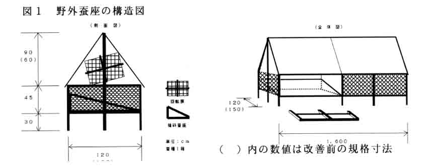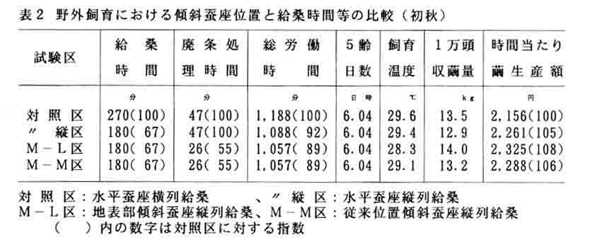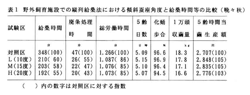 山間傾斜地の養蚕作業における、養蚕婦人一人を想定した作業体系において、効率的な繭生産を行うため、野外飼育の省力技術である5齢隔日給桑法と放置自然上蔟法に加え、簡易野外飼育施設と飼育法の改良により生産費と作業時間の低減を図る。