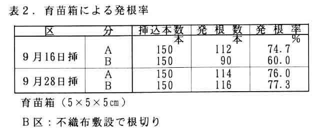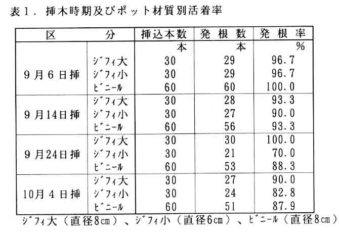 (図1)ジフィーポット、育苗箱発根状態 (表1)挿し木時期及びポット材質別活着率 (表2)育苗箱による発根率