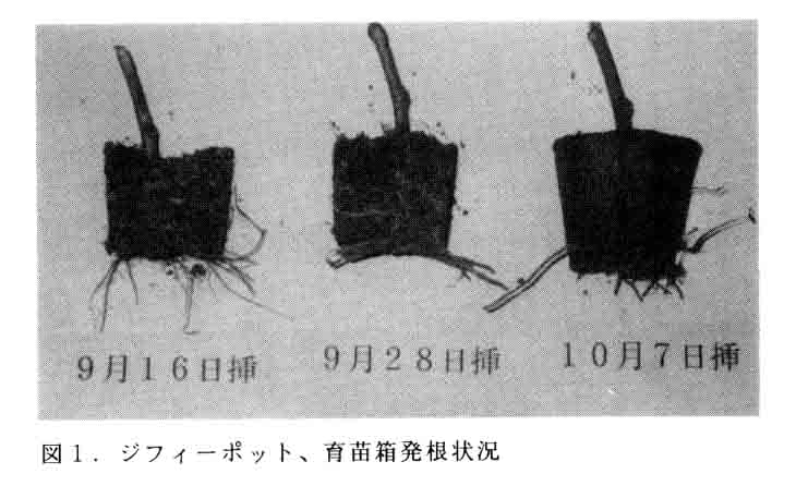 - 10月上旬挿の場合、ジフィーポットを利用すれば翌春の本圃植付が容易である。
