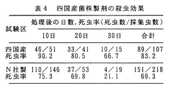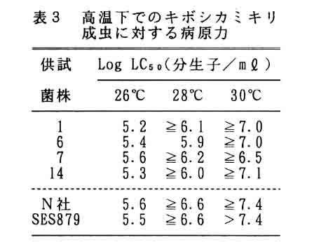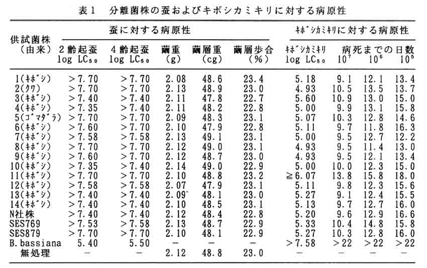 桑の重要害虫であるキボシカミキリ成虫の発生消長には地方により異なり、西日本では初夏最盛型を東日本では秋期最盛型を示す。関東周辺のキポシカミキリの天敵糸状菌としてBeauveria brongniartii が知られ、本成虫に強い病原性を示すことから微生物的防除への利用が図られつつある。そこで、本県をはじめとする西日本地域でのカミキリムシ類の天敵糸状菌相を明らかにするとともに、分離菌の特性を調査した。