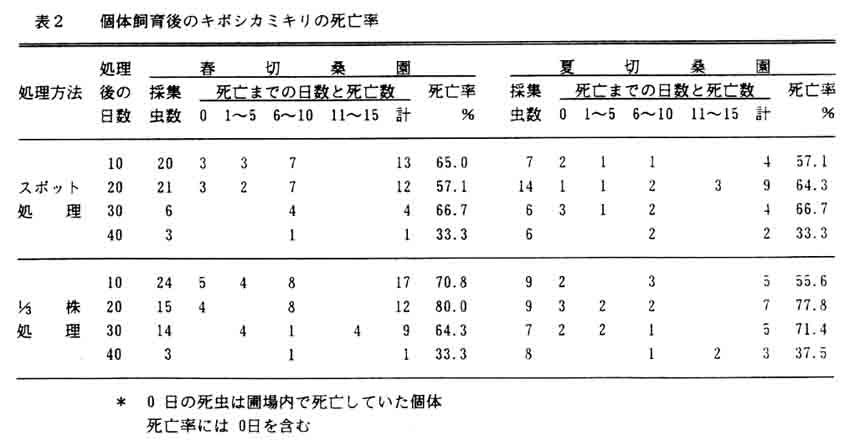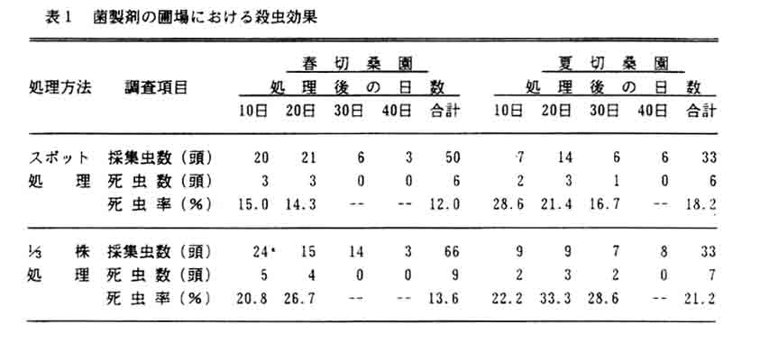 キボシカミキリの防除は多回育の実施により殺虫剤の使用に制約があることや穿孔牲の害虫であることから効果的な防除法が確立されていない。そこで、生物農薬として開発が進められているBeauveria brongniartii 菌製剤を使用した実用的防除法を検討した。