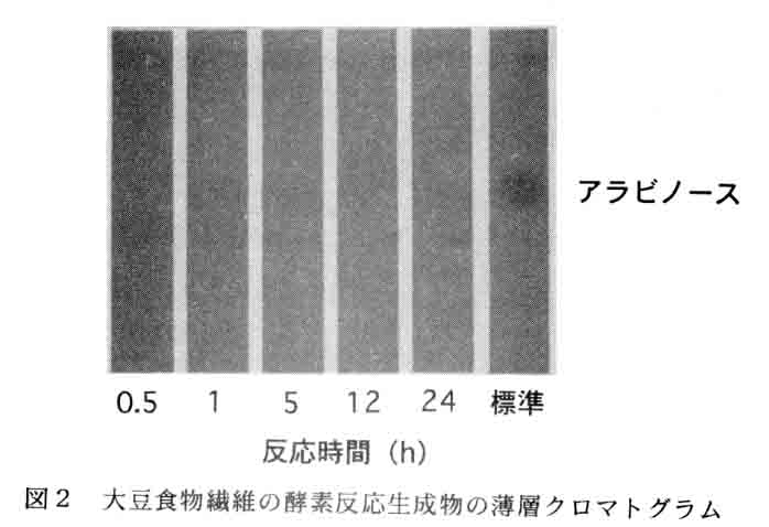 大豆煮汁から分離した大豆食物繊維は、ペクチン様多糖類として固有の性質を有し、食品加工素材として利用が期待される。しかしながら、その構造中に着色原因物質となるアラビノースを有するため、アミノ化合物を伴った食品への利用上問題となる。そこで着色原因物質となるアラビノースを食物繊維から除去し、加工素材としての用途拡大を図る。