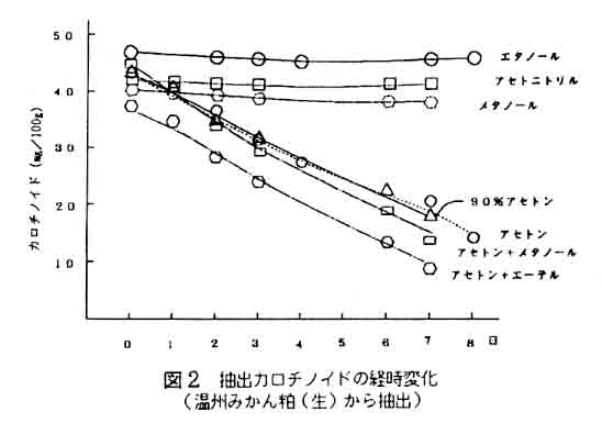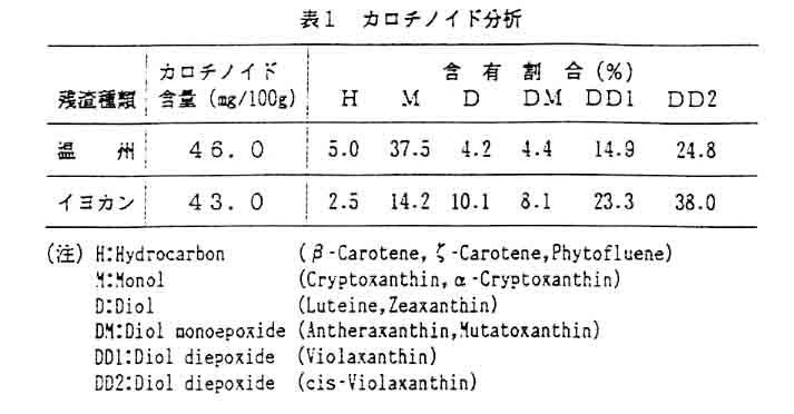 カンキツ類の果皮を主とした加工残渣には、抗酸化成分等多くの有効成分が含まれているが、大部分が飼料としての利用に止まっており、有効成分の活用があまりなされていない。そこで先の研究では抗酸化成分(トコフェロール)の利用技術について確立した。本研究では、残渣の全利用を目的として、色素、食物繊維等有効成分の抽出、微生物利用による新たな有効成分の産生技術について研究する。平成6年度は、残渣中の色素の利用技術を確立する。