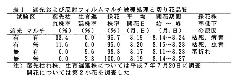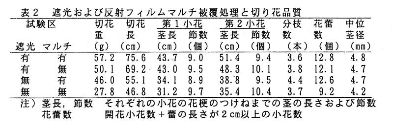 遮光処理は切り花重と切り花長の増加に効果があり、それそれ無処理の約1.8倍、1.5倍になった。反射フィルムマルチは、分枝数と花蕾数の増加に効果があり、それそれ無処理の約1.2倍、1.4倍になった(