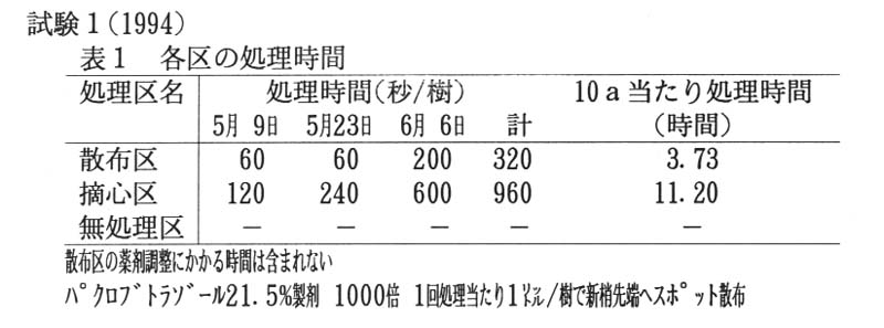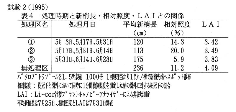 高品質で均質なもも生産のためには、新梢の夏期管理が大切である。しかし、収穫前後の時期にこの作業を行うのは、労力的に困難となっている。そこで、新梢伸長抑制剤パクロブトラゾールを用い、新梢管理の省力化を図る。