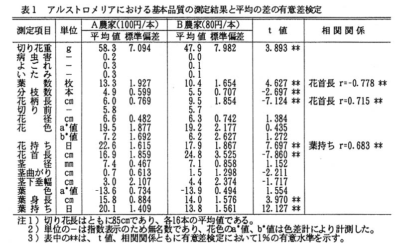 そこで、3月13日の松山市場において、販売規模や販売の継続性などの流通要素が同レベルであるにもかかわらず、100円/本(A農家出荷)と80円/本(B農家出荷)の価格差が発生した2L秀品規格(切り花長85㎝以上のA級品)のアルストロメりア(品種:ウイルヘルミナ)について、その品質差を究明することにより、高品質生産物として評価されるために不可欠となる品質の諸特性を明らかにする。