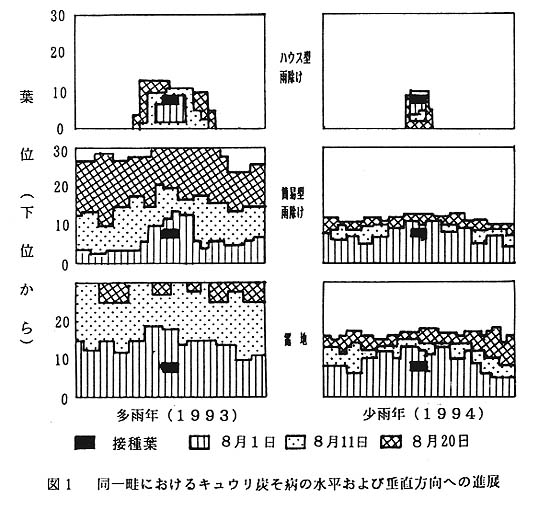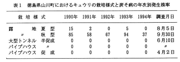徳島県中部の夏秋キュウリの、露地栽培では毎年のように炭そ病が発生し、被害がみられる。ウリ類の炭そ病については1950年代に病原菌の生態等が洋細に報告されているが、栽培様式等の関連を述べたものはなく、また降水量等気象との関係についてなお解析が不十分な面がみられる。そこで本病の発生と栽培方法並びに気象との関係について検討し、防除対策の一助とする。