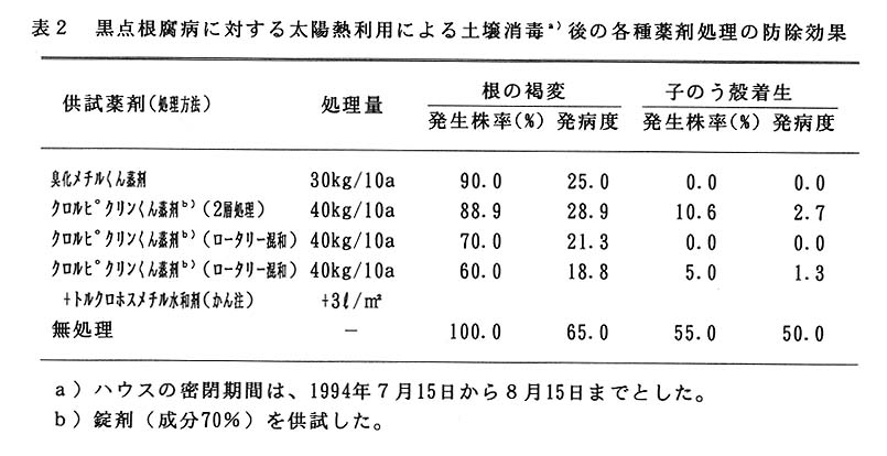 メロン黒点根腐病は、メロン栽培の増加に伴い被害が増加してきた病害で、対策としての土壌くん蒸剤の効果が十分とはいえず、太陽熱利用による土壌消毒を含めた防除方法の確立が望まれていた。
