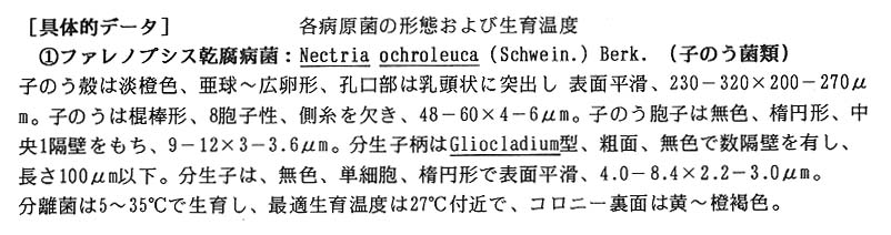 新病害:①ファレノプシス(コチョウラン)乾腐病は香川県綾歌郡の切り花生産農家で発生し、下位葉輪に初め灰緑色、後に暗色に乾燥する病斑が広がり、葉輪の半分以上が侵されると葉身が早期黄化・落葉するほか、罹病部が生長点に達すると株全体の枯死に至るのが特徴。