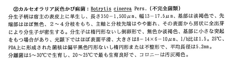 国内初発生病書:②カルセオラリア灰色かび病は香川県満濃町で発生し、主に培土に接した下葉より、初め水浸状暗緑色の病斑が広がり、病斑は中央部から徐々に褐色から淡褐色に乾枯するか、多湿の場合は暗褐色に軟腐し、表面に淡褐色ないし灰褐色のかびが密生するのが特徴。冬期、加温施設で被害が著しい。