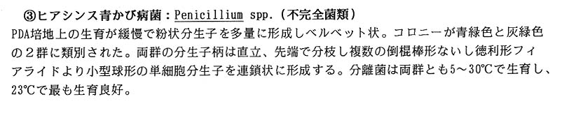 ③ヒアシンス青かび病は香川県善通寺市で発生し、花穂が褐色に枯れ、枯死部に青緑色粉状のかびが生じ、発病株の球根表皮や鱗茎上部にも同様のかびが大量に観察されるのが特徴。低温・多湿条件下での水栽培で赤・紫系品種に発生する。